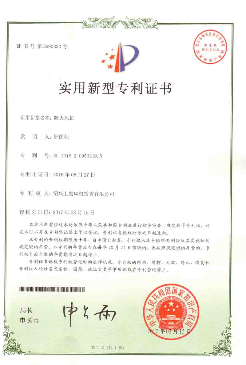 防火風(fēng)機專利證書 |